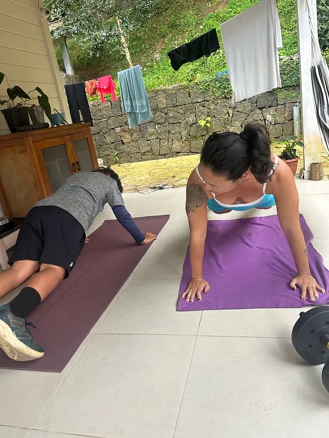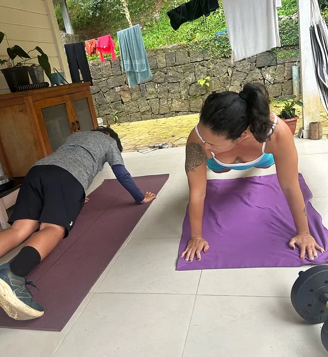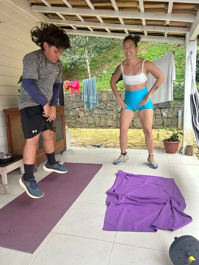 E então ele veio me pedir ajuda: queria ser mais rápido, mais magro — além de forte. Como mãe que treina, fiz o que eu podia: montei treinos de sprints, burpees, agachamentos com saltos, flexões e corridas um pouco mais longas. E fiz com ele, todos os dias.