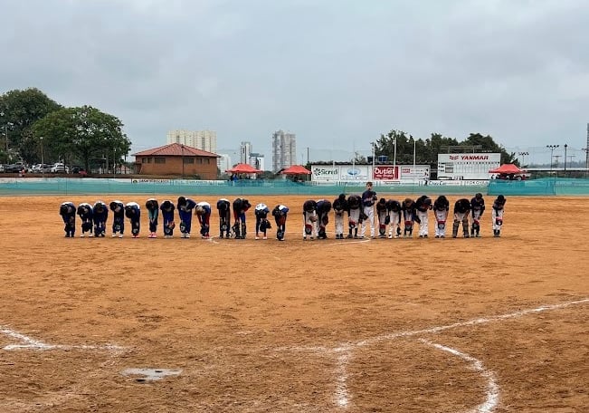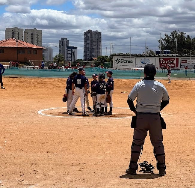 Os infielders reunidos no montinho, quando o sensei Fabrício pediu tempo para motivá-los