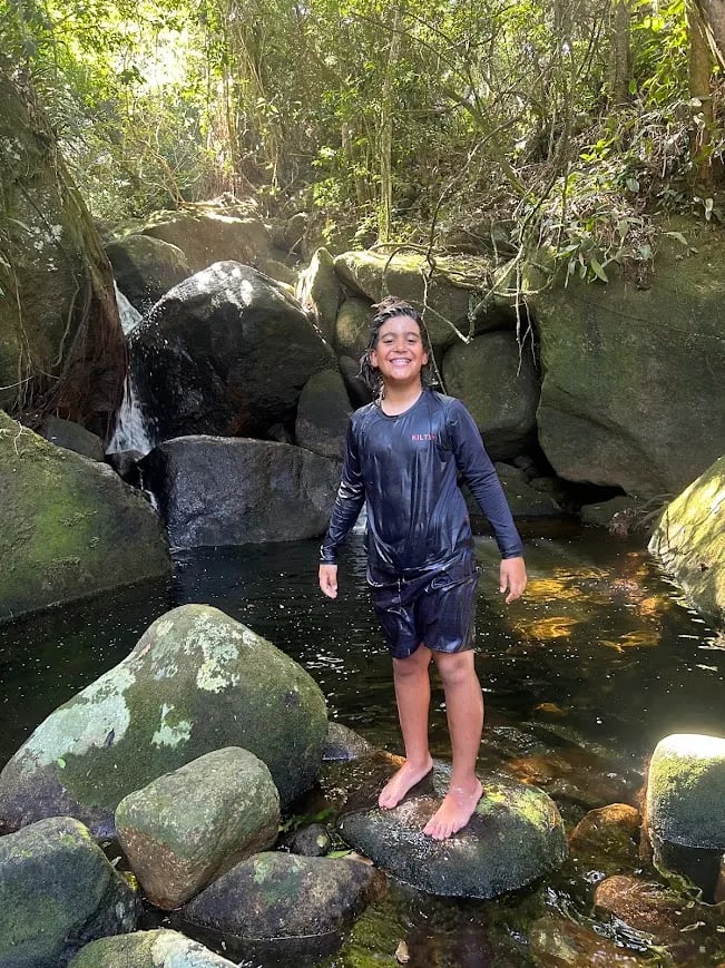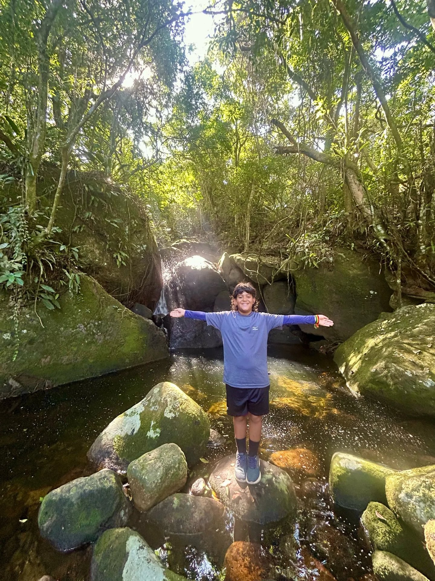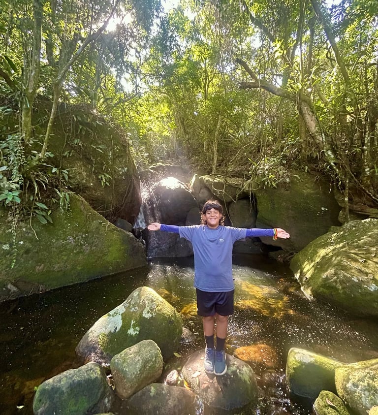 Ele concordou e seguiu. Reclamou, parou algumas vezes, mas continuou. E fomos conversando sobre várias coisas: treinos, escola, desenhos… A cachoeira, quando apareceu, era pequena, mas linda. Envolvida na mata atlântica preservada, a água escorria pelas pedras, formando piscinas claras e rasas, e uma maior, um pouco mais funda e escura, com a queda maior ao fundo.